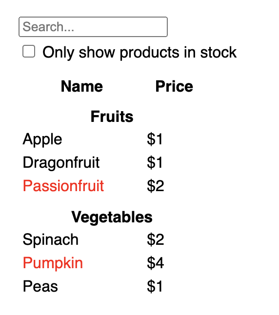 You can start seeing how your application will behave. Edit the filterText initial value from useState('') to useState('fruit') in the sandbox code below. You’ll see both the search input text and the table update: